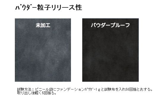 化粧品のパウダーは、衣服に付くと取れにくく、パウダー汚れは気になるものです。また、花粉の季節には、衣服に付く花粉が気になるものです。パウダーや花粉を付きにくく、付いても軽く振り払うだけで簡単に振り落せるようにする加工です。